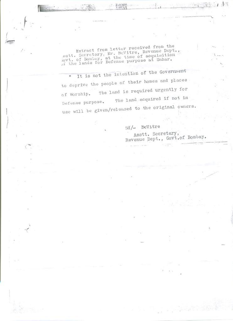 It is the pol Icy of the Government, says the Press Note, that when land is relinquished the owners and tenants should be given the “first refusal”, and the Government of india are consulting provincial governments with view to settling an appropriate procedure. Meanwhile, and tenants of land taken over by Government can rest assured that every consideration will be given to their Interests If Government later decide that they no longer require the land…. Associated Press ↩︎ - Extract from letter received the Asst. Secretary, Mr. DeVitre, Revenue Dept. , Govt. of Bombay, at the time of acquisition of the lands for Defense Purposes at Sahar.